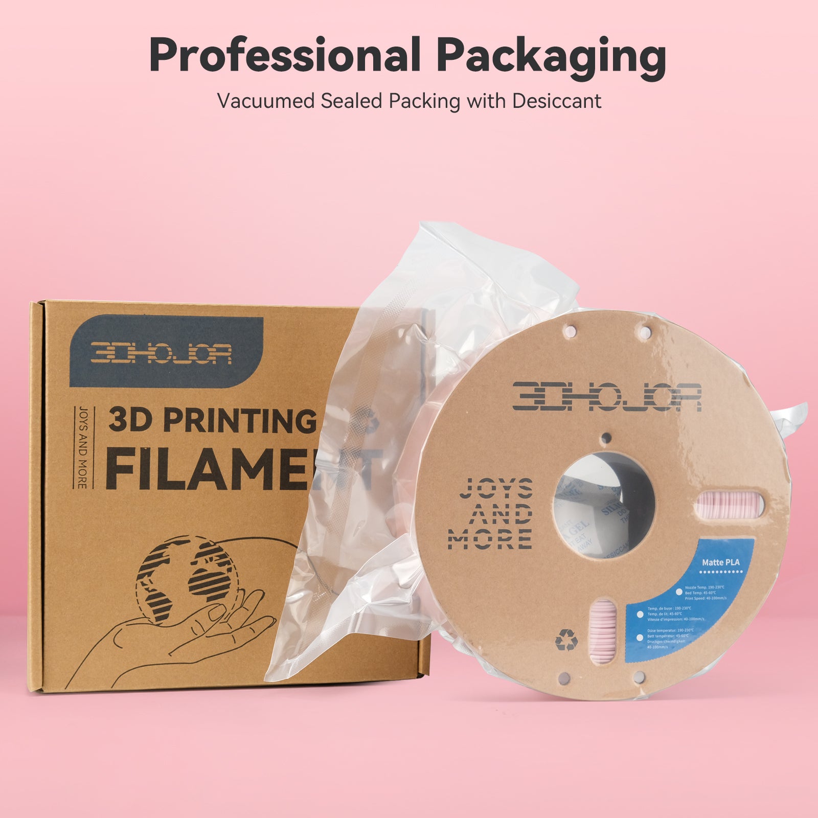 Matte PLA Filament is carefully winded to avoid any tangling issues, dried and vacuum sealed in a resealable ziplock bag with desiccant.